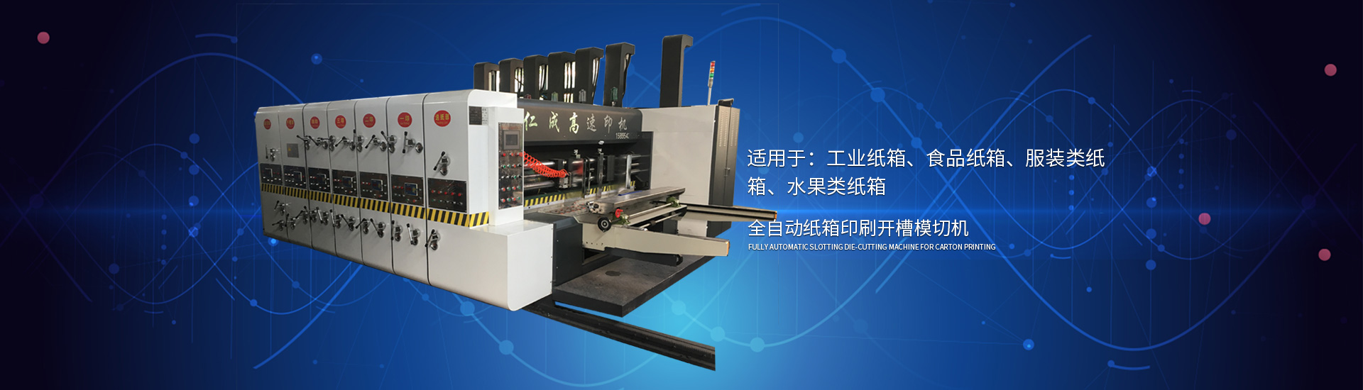 主要產品有高速印刷開槽模切機、半自動水墨印刷開槽模切機、全自動粘箱打包聯動線、全自動 插格機、半自動粘箱機、半自動釘箱機、手動釘箱機、薄刀分紙機、PE繩打包機、PP帶智能打包 機、圓壓圓模切機、平壓壓痕機、自動裱紙機、水墨污水處理機等產品